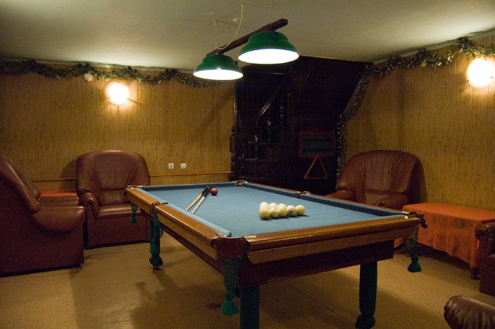 Не хочется в бассейн? Не проблема! Вместо этого можно передохнуть в нашей комнате отдыха. Мы постарались создать здесь комфортный, стильный интерьер из максимально натуральных, экологичных материалов, выбрать мебель, которая будет одновременно удобной и эстетичной. Надеемся, что он придется вам по душе! Для создания настроения у нас есть бильярд и кальян. Также у нас работает бар, где вы можете заказать блюда русской кухни. Только не забывайте, что плотная трапеза непосредственно перед посещением парной - это не самая хорошая идея, согласно мнению докторов. А вот после парной - совсем другое дело!